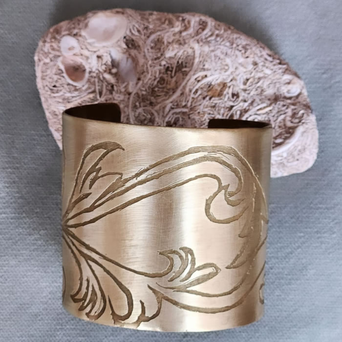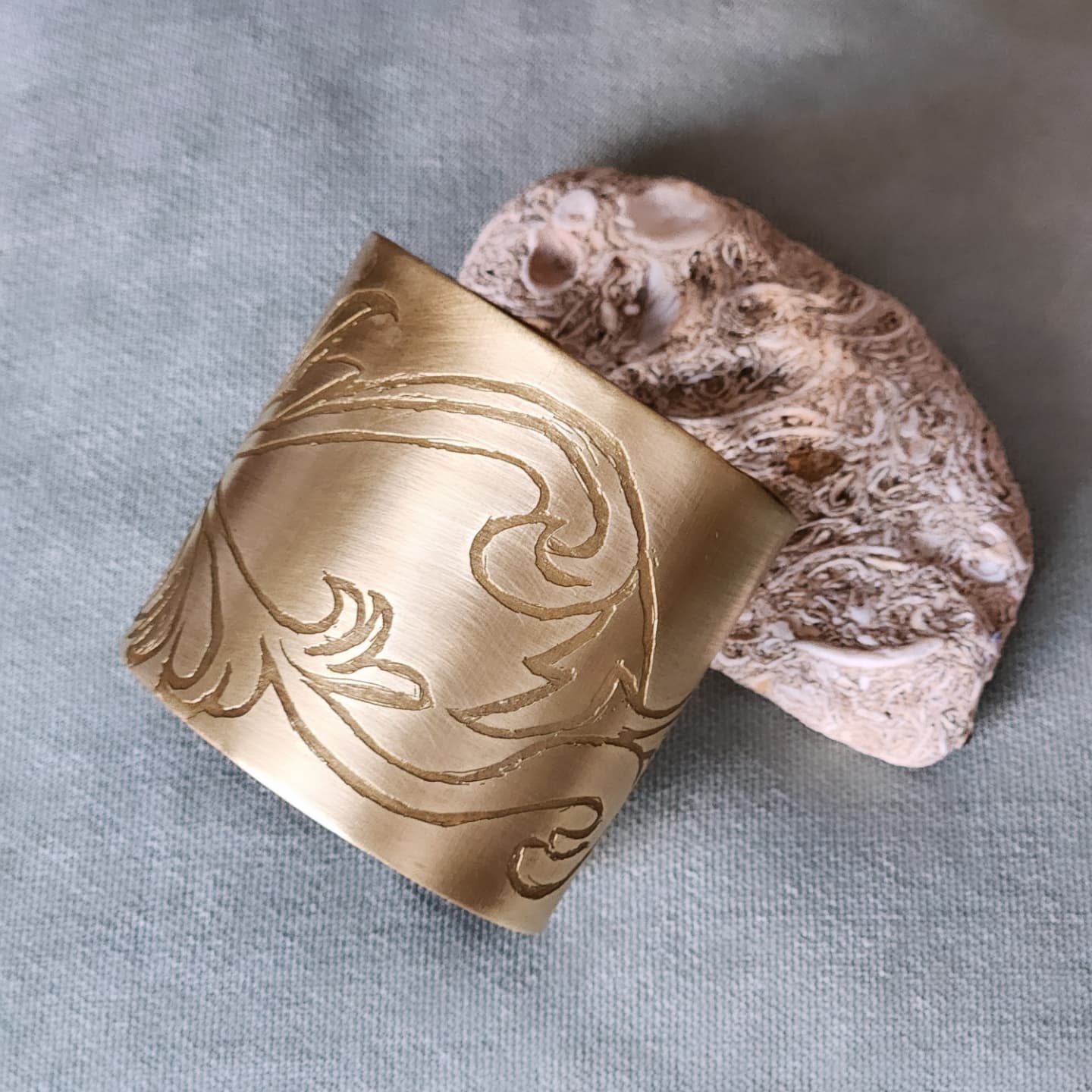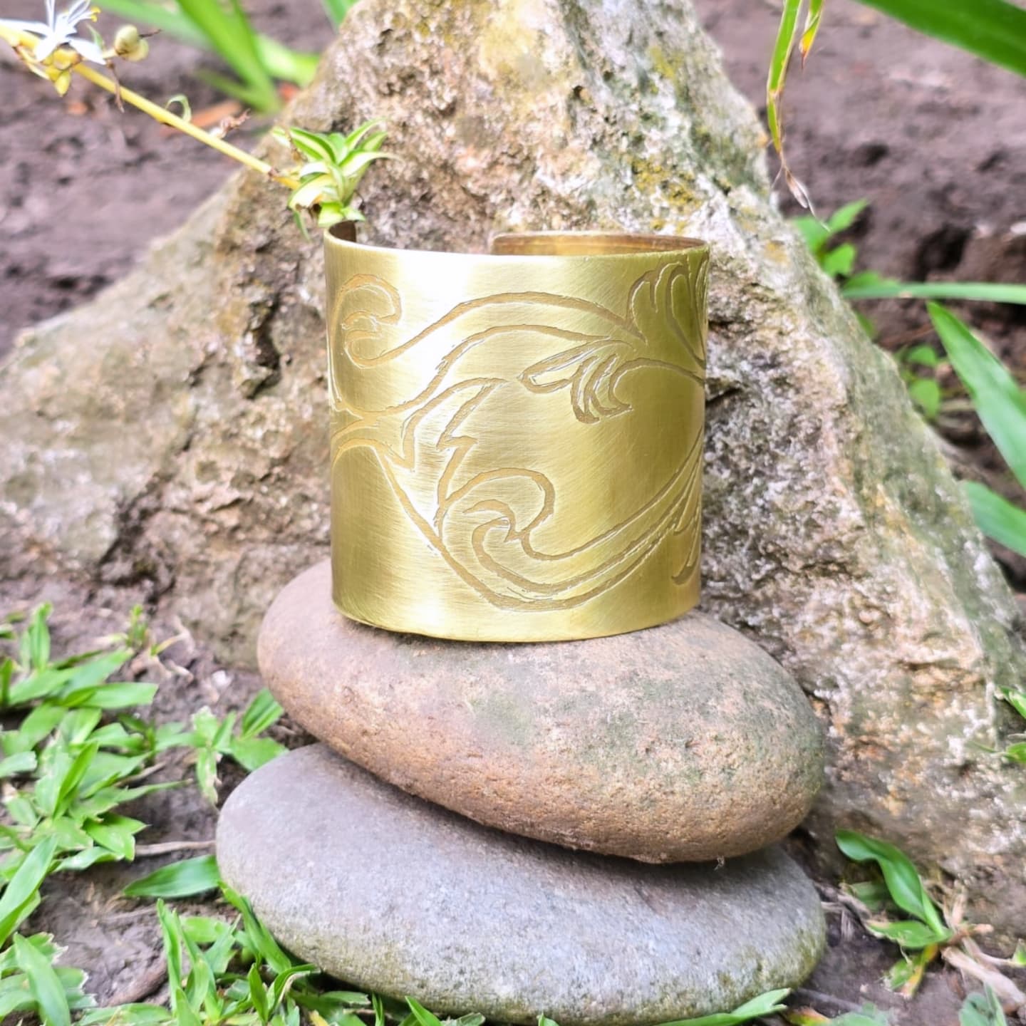 Una joya que trasciende lo convencional. Este brazalete combina la fuerza del bronce con un acabado marcado por acido, creando patrones únicos que celebran la imperfección y la belleza del arte hecho a mano