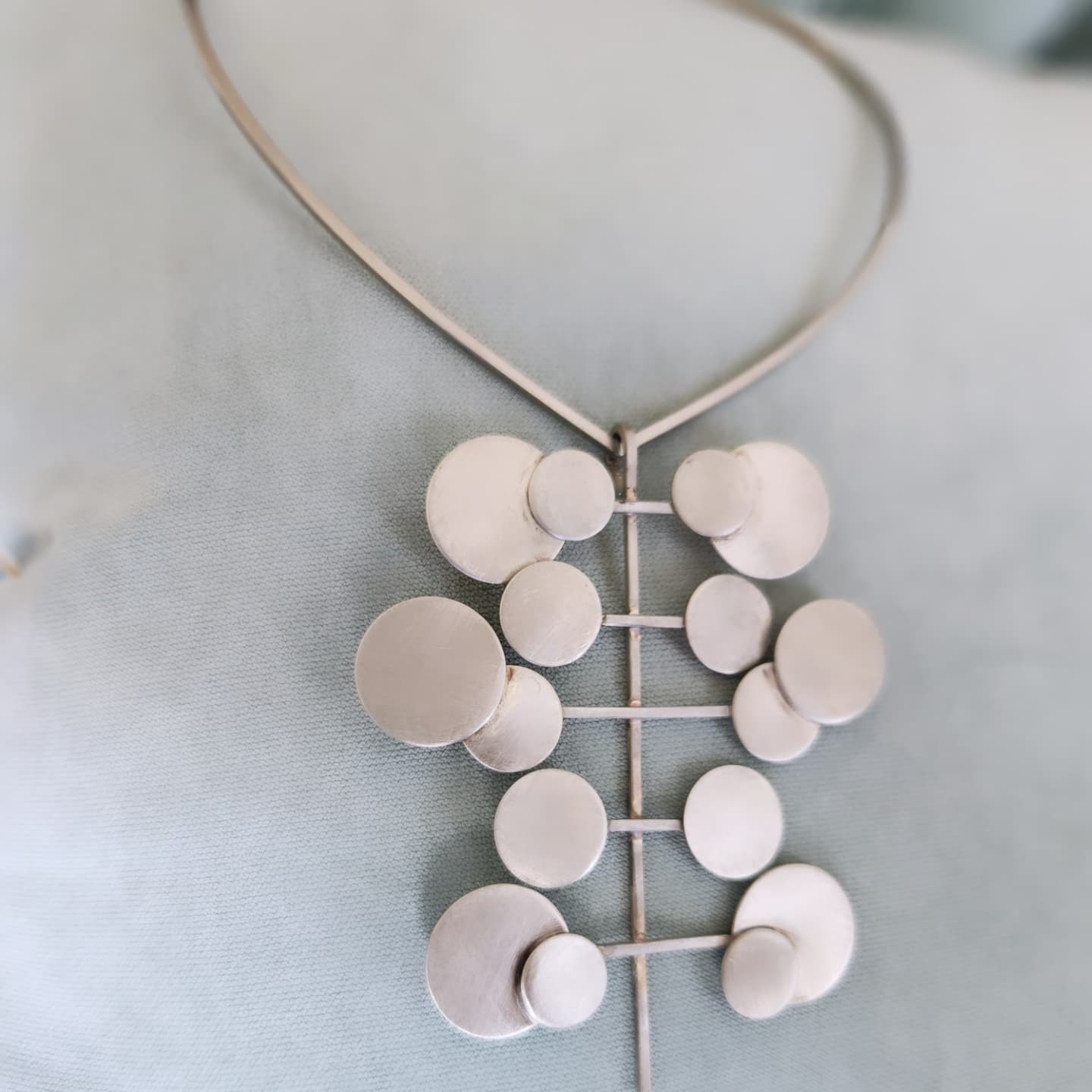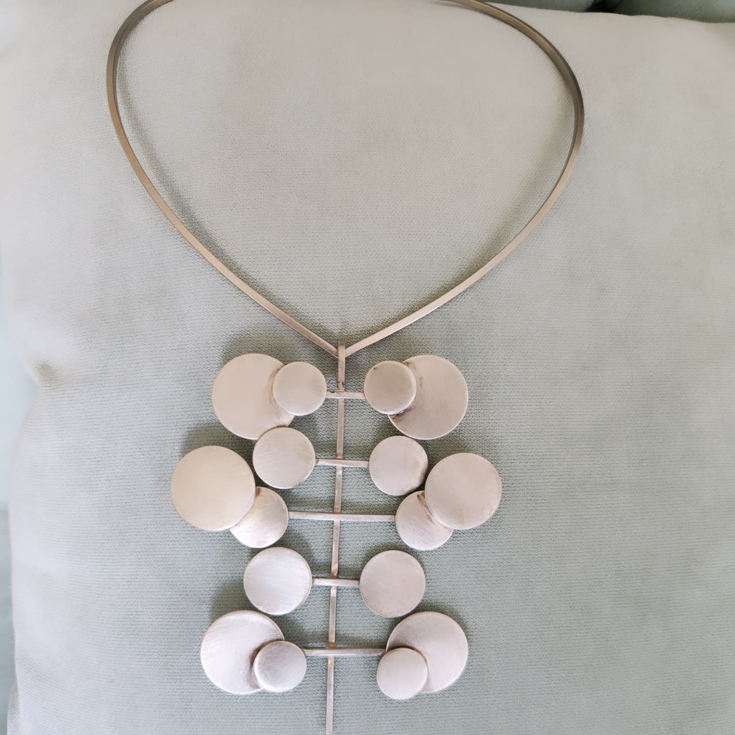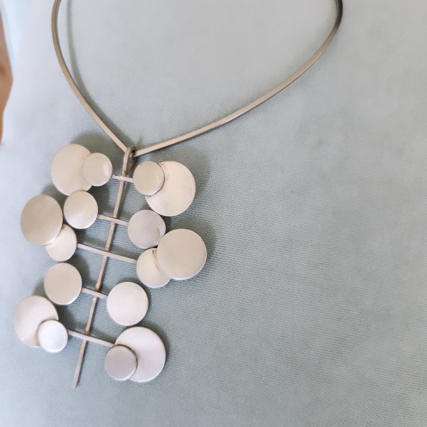 Este collar artesanal, elaborado con alpaca pulida se, destaca por su elegante diseño geométrico. Es una pieza única ideal para sobresalir en cualquier ocasión