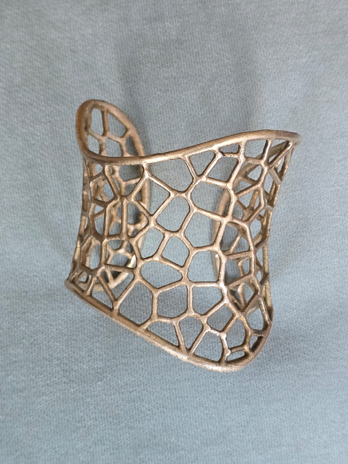 Perfecto para cualquier ocasión, desde reuniones casuales hasta eventos formales. Su estilo minimalista lo hace ideal para complementar cualquier outfit. Hecha en bronce texturada y calada